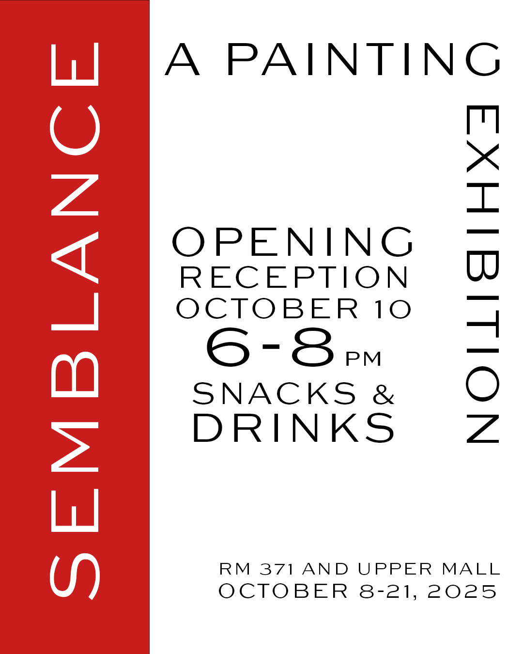Please join us on Friday, October 10 from 6-8 p.m. in RM 371 and the Upper Mall for the opening reception of Semblance - A Painting Exhibition, presented by the third and fourth year painting students. Snacks and drinks will be available.