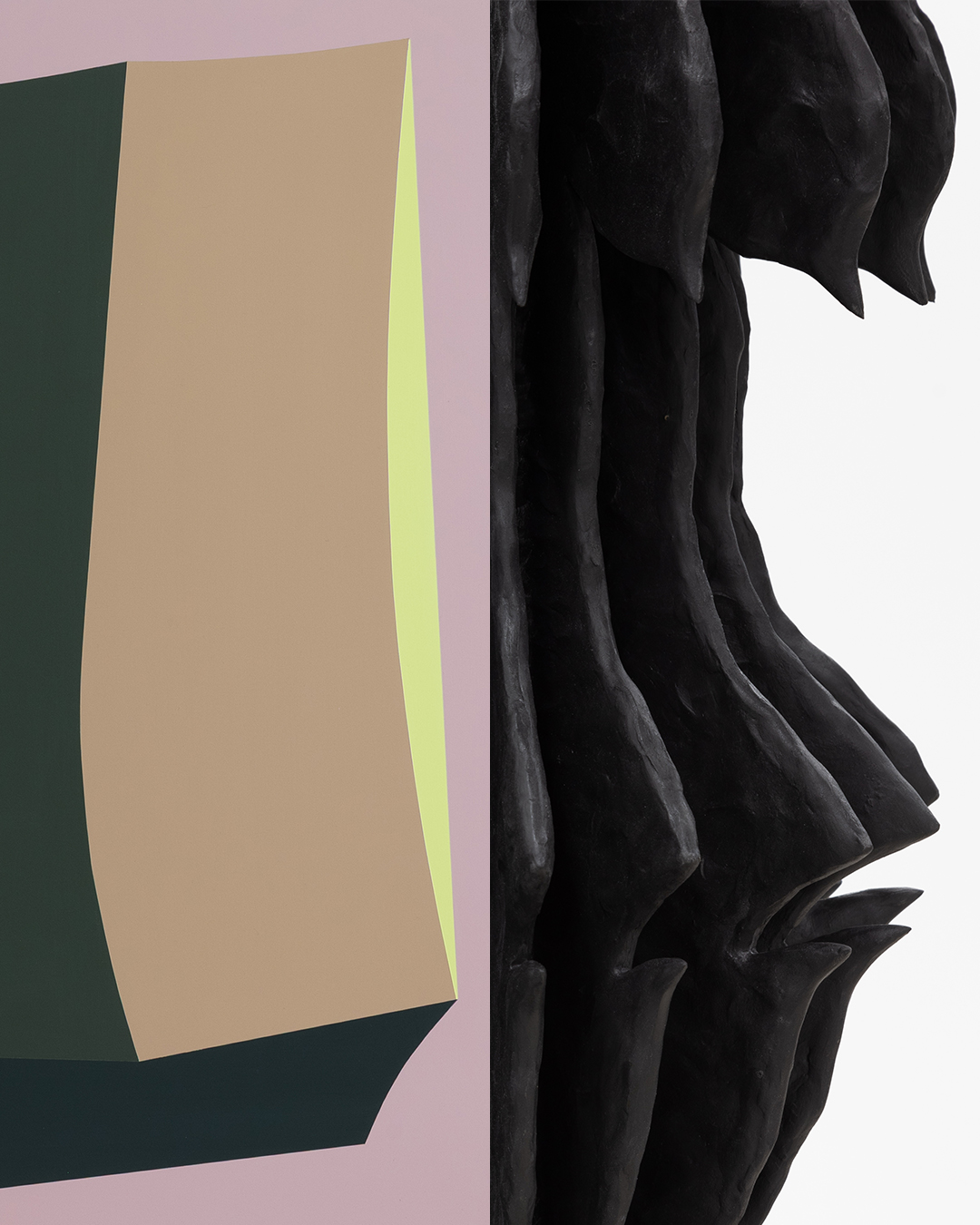 The works in Grinning are simultaneously joined and unjoined—through fastener and form—articulated by seams and hinges. Both Larissa Tiggelers (BFA '10, Painting) and Emma Welch have similar preoccupations with repeats, mirroring and multiplicity. In Tiggelers’ corner paintings, each side attempts to mirror the other, hinging and splitting open, anticipating and attempting to match its counterpart. In Welch’s sculptures, fins duplicate, their hand-formed surfaces fanning in radial repetition.