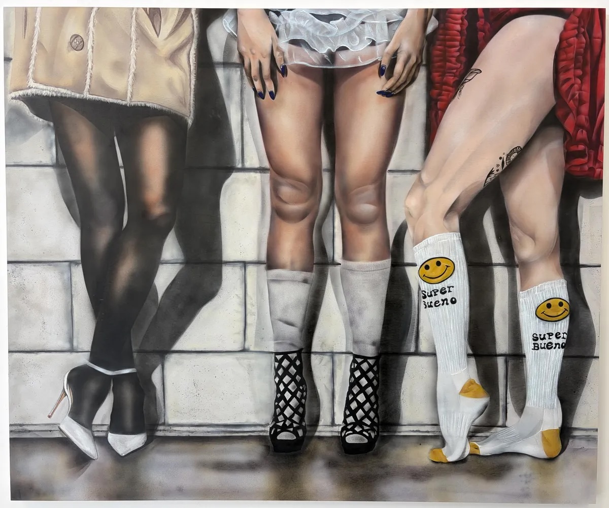 Each painting begins as a staged and choreographed scene in which the artist performs, using costumes and theatrical props to construct fictional environments. These moments are documented and translated into luminous airbrushed compositions that blur fantasy and lived experience. The resulting paintings feel playful and immersive, unfolding like fragments of a larger narrative shaped by identity, transformation, and self-invention.