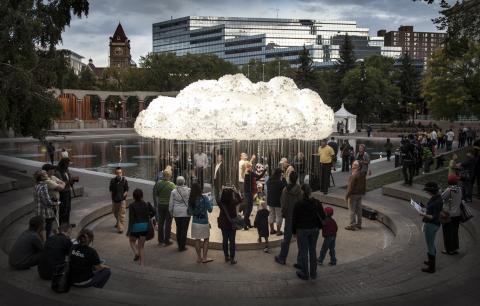 CLOUD, Caitlind r.c. Brown & Wayne Garrett, 2012. Light bulbs, steel, electronics, pull chain switches. Participants pull on/off switches to animate "lightning" on the CLOUD’s surface. Chaos and harmony between people elicits different responses. Commissioned for Nuit Blanche Calgary. Photo by Mitch Kern