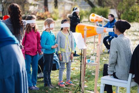 Without Eyes, Lane Shordee, Nikki Martens, and Caitlind r.c. Brown, 2016. Found materials, wood, text. Performers sit in a ring, reading aloud. Viewers are blindfolded, and brought into the ring to listen to voices move in and out of sync as they walk around. Presented at M:ST Performance Art Festival. Photo by Diane + Mike Photography.