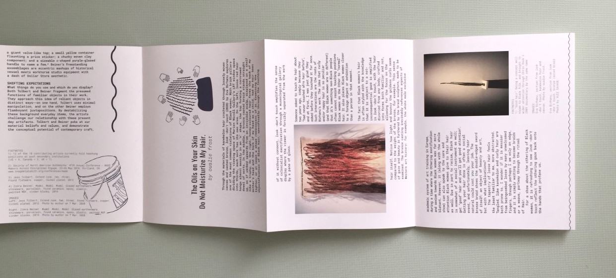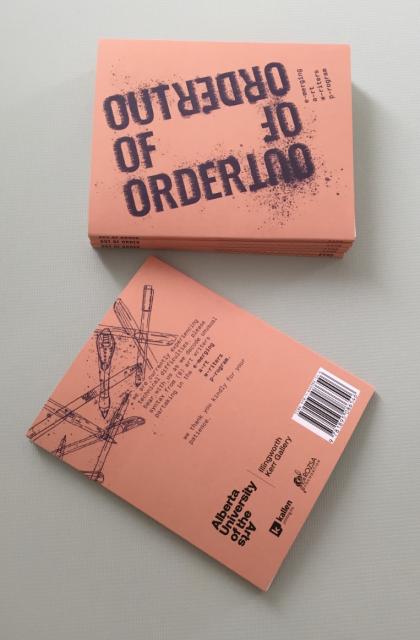 The IKG’s Public Programming and Outreach Assistant, Reeny Hua, worked collaboratively with Rachel MacKinnon, a 4th year Illustration student, to create the editorial layout and design as well as spot illustrations that respond to the participants writing. After a design meeting with the writers, Reeny and Rachel produced an 87”, 12 panel accordion-style catalogue with a book jacket. The texts are printed at different orientations, requiring readers to fold and unfold, flip and turn the pages creating an active and tactile reading experience.