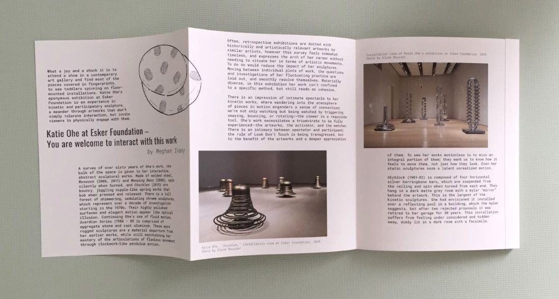 With the generous support of an Action Learning Grant from the Rozsa Foundation we were able to organize the first iteration of the Emerging Art Writers Program. Continuing into April of 2020, the participants took part in a series of workshops and editing sessions led by Clintberg to develop written responses both to exhibitions on campus and within the community. Award-winning senior art critic Nancy Tousley was invited to lead an editing session and provide feedback on the students’ writing. Upon completion of the workshop series, each of the participants produced a final draft of their writing to be published in a printed catalogue.