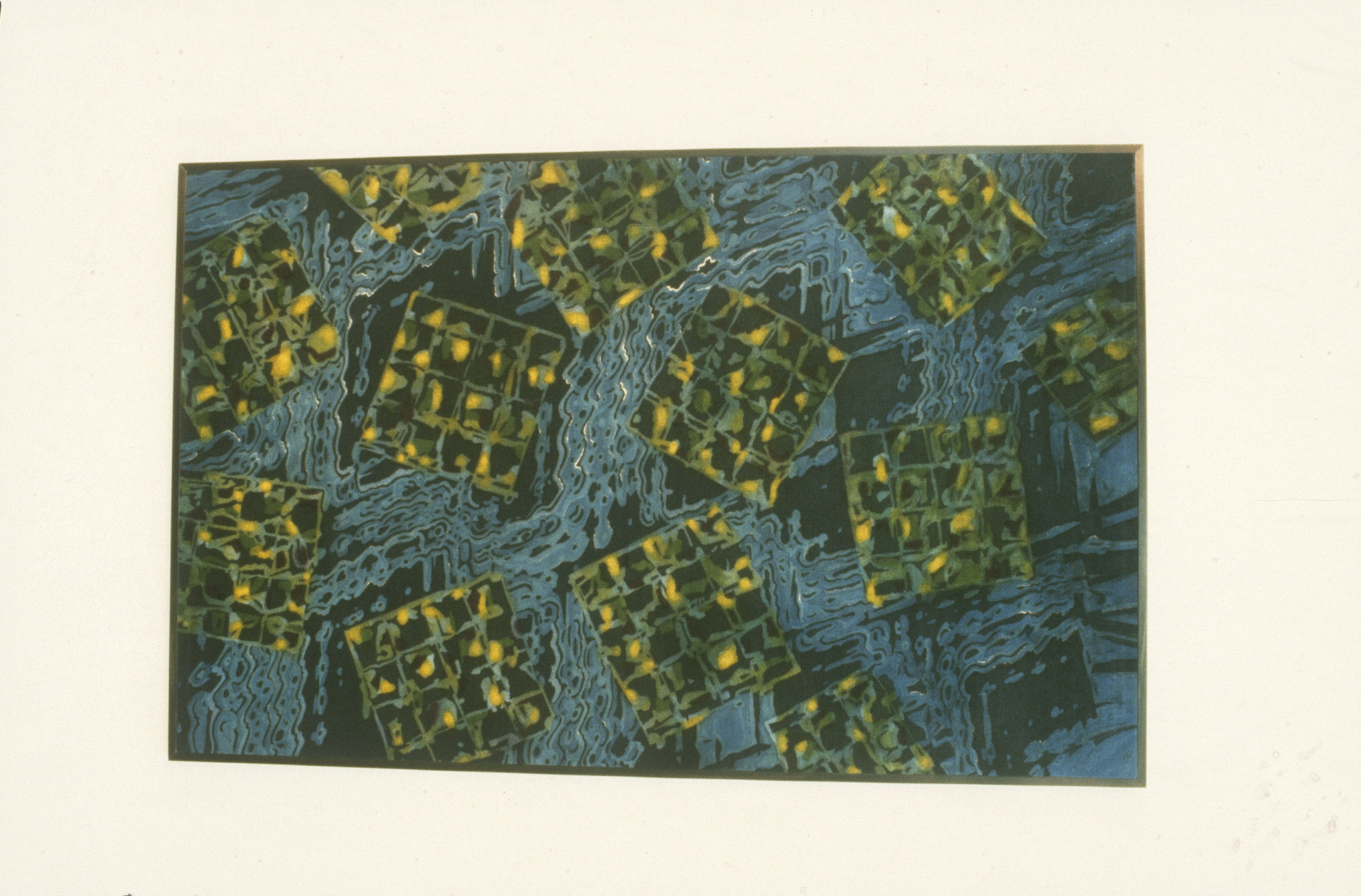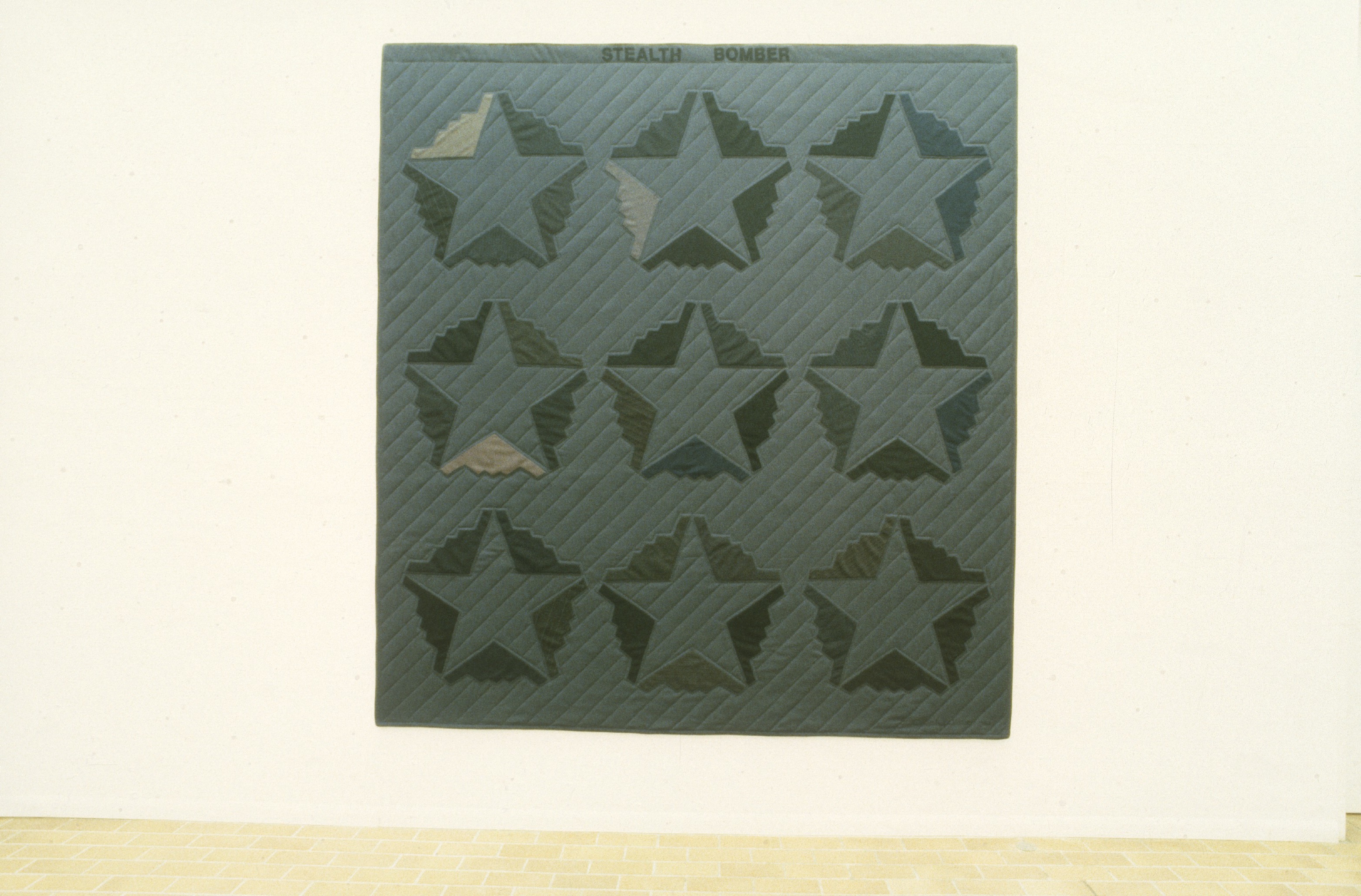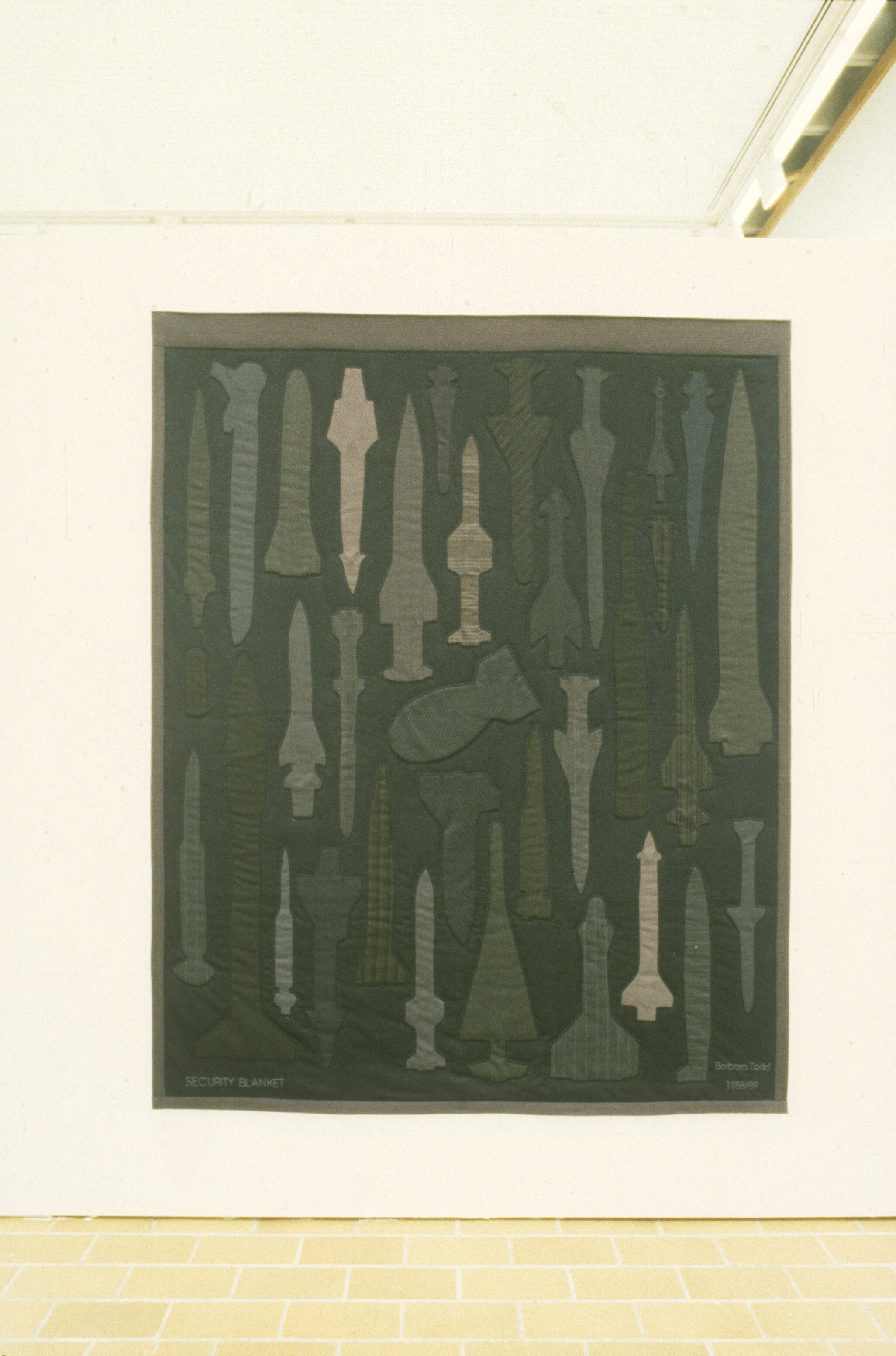 The work places two sets of concepts in the closest possible juxtaposition: the form of the hand quilted bedcover, with its connotations of warmth, care, economy and female handwork, and imagery of bombs and missiles, the dominant masculine icons of our civilization. It is my hope that through persistent juxtaposition, the work will have the effect of collapsing the separation between public/private, masculine/feminine, political/personal.
