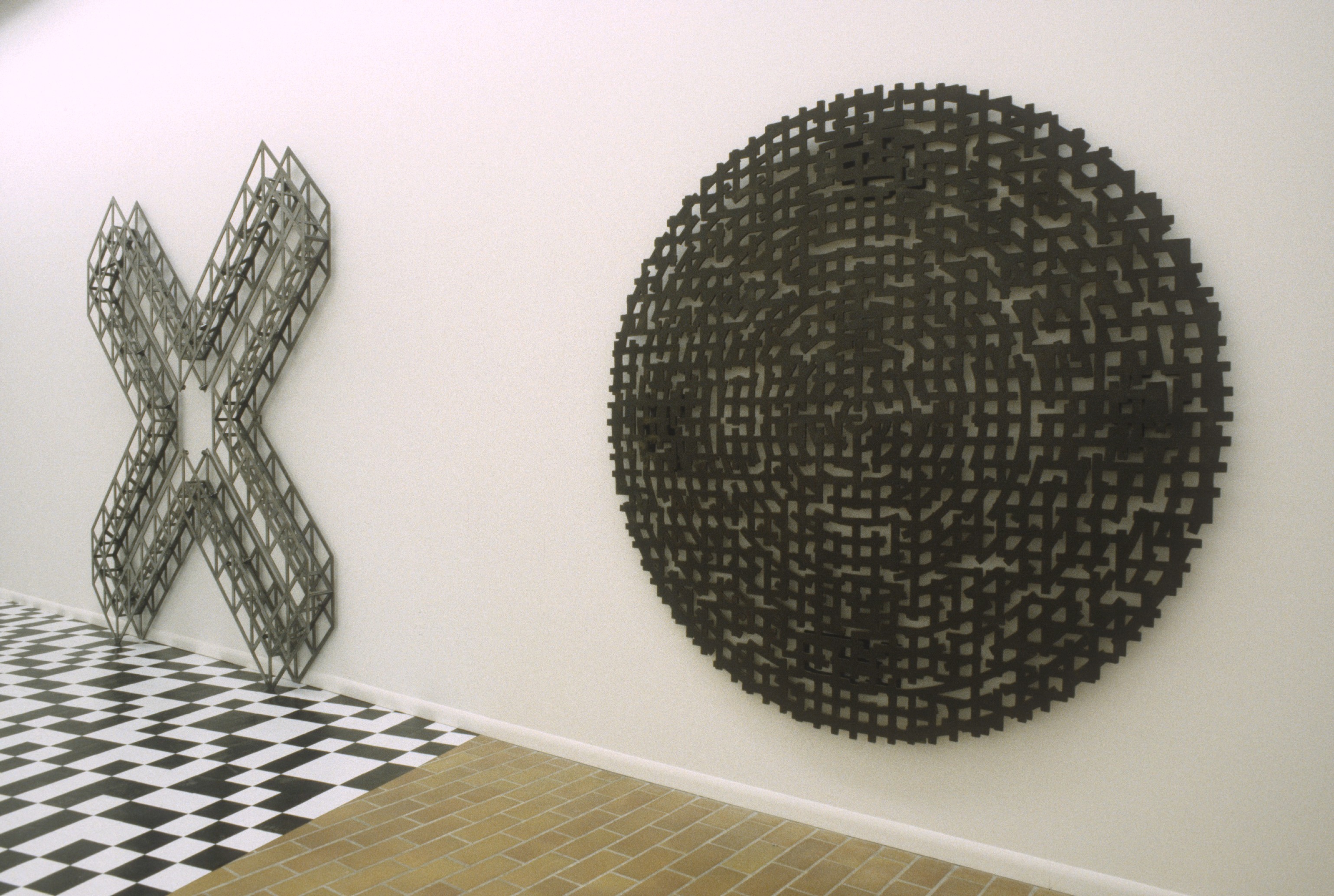 Schwarz, a sculptor, and Stamp, a painter, write: "Beginning in February, 1992, through a series of discussions and written exchanges, we clarified many creative and conceptual overlaps in our individual practices. Besides the evident use of geometric abstraction, we share an underlying subversive stance to our respective disciplines ... For the exhibition, each artist will ... [push] the boundaries .... Arlene Stamp will remove the 'painting' from the wall ... while Judith Schwarz will locate the 'sculpture' on the site of painterly illusion in her dissolution of the opaque wall."