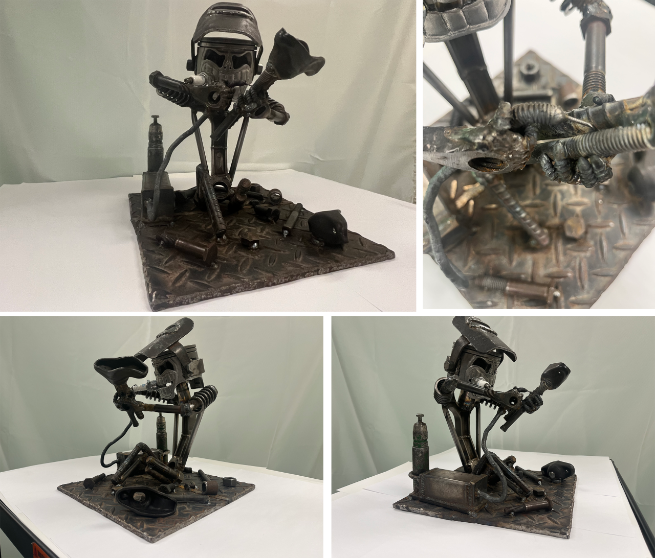 Striker The unfinished manThis piece is made completely of recycled steel scrap, it showcases a man welding his own leg together while his environment is littered with other various parts (some useful, some not) it is supposed to represent the idea of how someone has to build them self out of what is around them, sometime they will never truly be finished. |