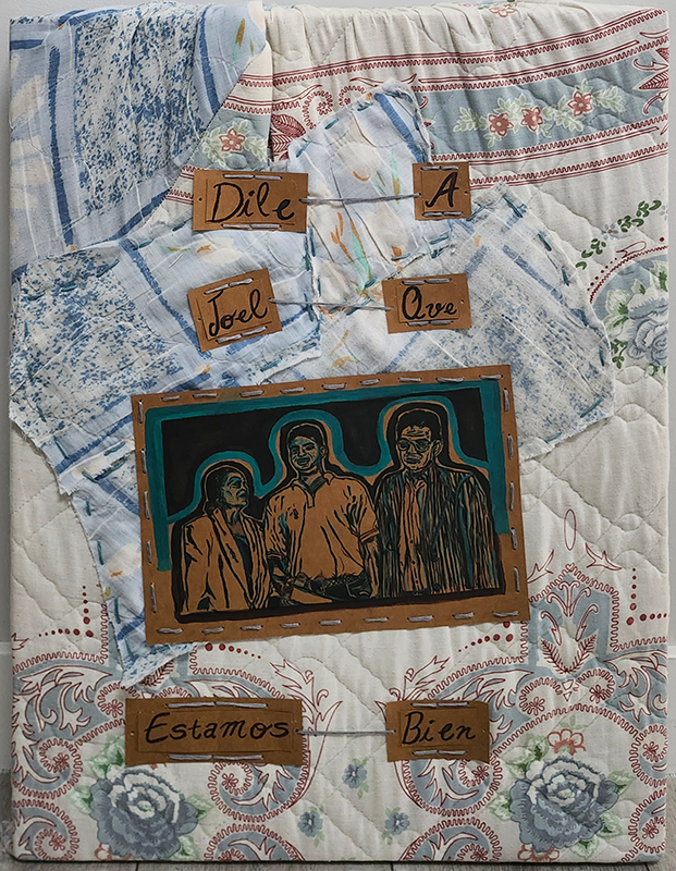 For PapiFor Papi: my father’s parents died a couple of years ago, and I wanted to make something to commemorate them as well as be a gift for him, something that hopefully might make him feel better. A linocut print of all three of them at my dads high school graduation, sewed into my grandparents duvets that my dad brought back from Venezuela after the last funeral that, luckily, i cut pieces of hastily before he threw them away, and a quote from a dream my mom had where my abuelos asked her to tell my dad that they were okay. I love my dad, i love both my parents— and i hate the thought of losing them— so this is my way of trying to help him get through it and grieve. It’s for my papi. |